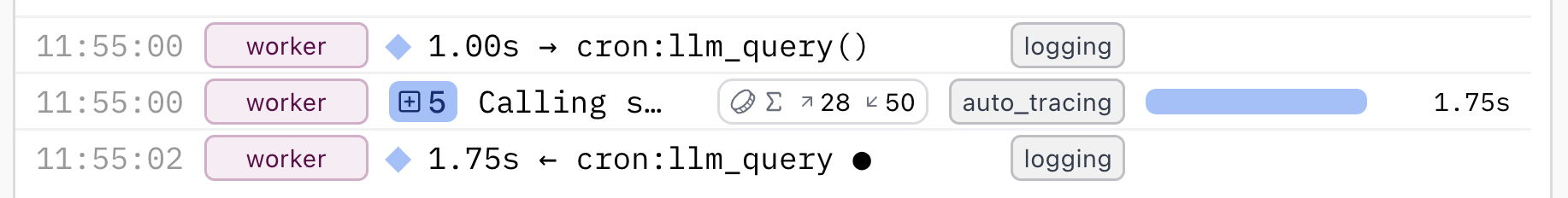 A span is the building block of a trace. You might also think of spans as logs with extra functionality — a single row in our live view.