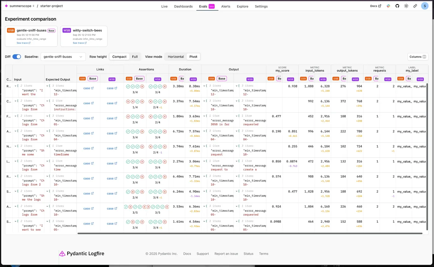 - Experiment name - Auto-generated by Logfire (e.g., "gentle-sniff-buses")